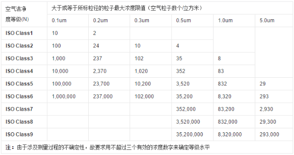 空氣潔凈度等級(air cleanliness class):潔凈空間單位體積空氣中,以大于或等于被考慮粒徑的粒子最大濃度限值進(jìn)行劃分的等級標(biāo)準(zhǔn)。